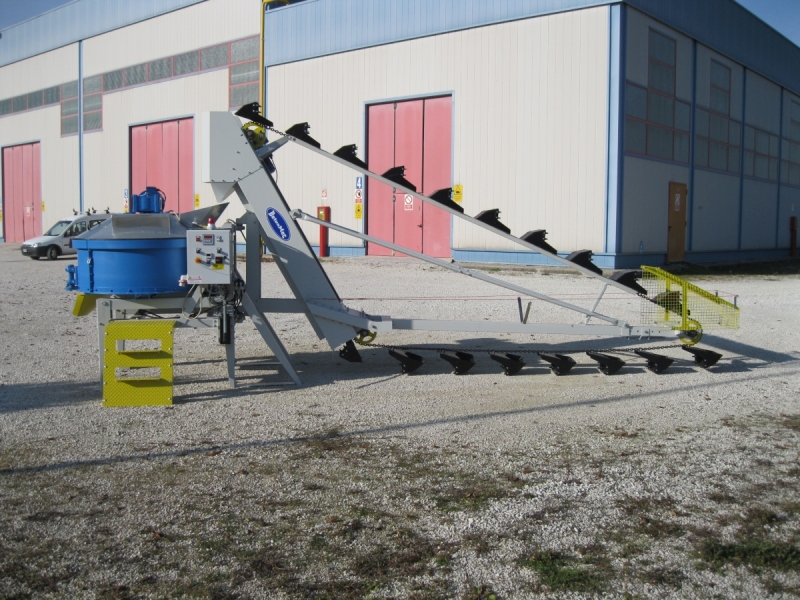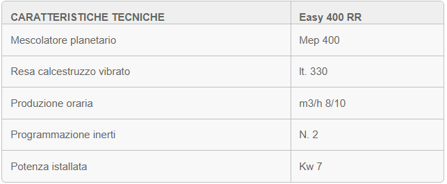 Impianto semiautomatico con sistemi di dosaggio a peso e mixer planetario, viene fornito in scatola di montaggio di dimensioni 1,2×1×2,8 m e peso 1800 kg ad un costo molto contenuto.