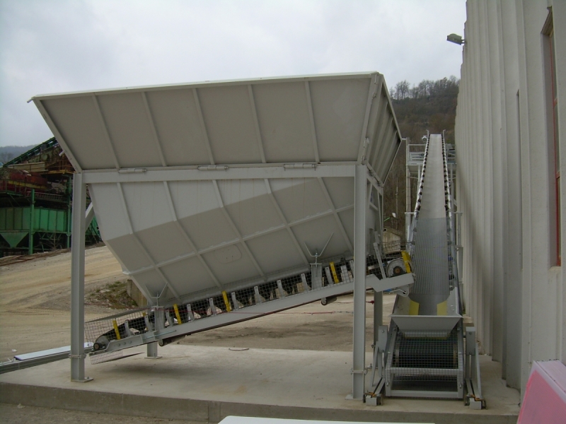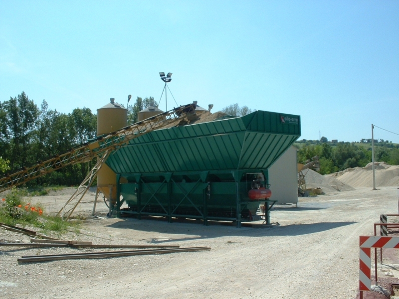 Sistemi dotati di tramoggia primaria (portata fino a 40 t.) alimentata con pala caricatrice o con scarico diretto da ribaltabile. A seguire un elevatore a tazze verticale o nastro primario inclinato, di tipo fisso o brandeggiante, alimenta le tramogge degli inerti. La possibilità di scegliere la singola tramoggia degli inerti viene resa possibile dall’istallazione di un nastro secondario distributore di tipo traslante o rotante.